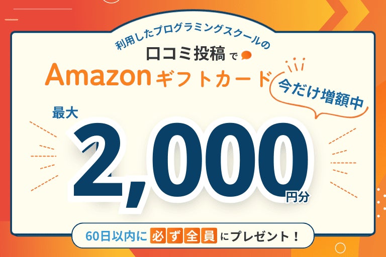 プログラミングスクールの受講生・卒業生でスクールの口コミをお寄せいただいたみなさまに、Amazonギフトカード(最大2,000円)をプレゼントします。