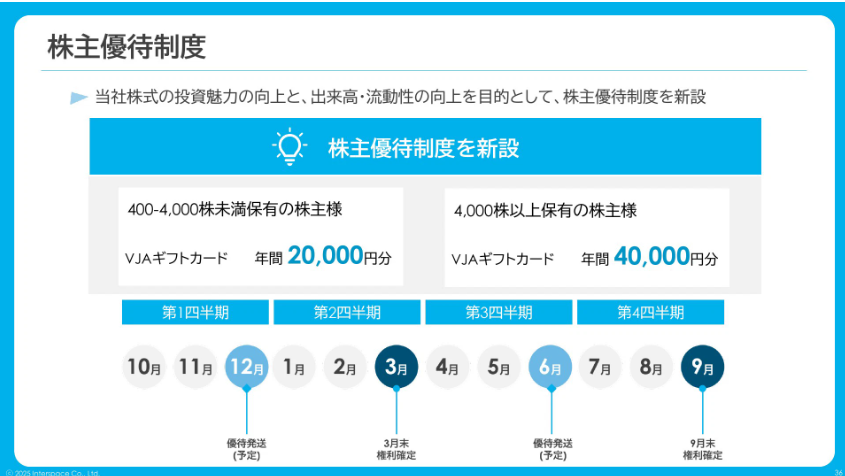 はい。当社の配当権利確定は期末決算月の9月に一度ですが、上半期の3月・9月の年2回の優待を組み合わせることで、年間を通じた投資検討タイミングや株価変動(ボラティリティ)の抑制を意識しました。「いつ保有していても安心できる」「どのタイミングで投資してもメリットがある」。そう感じていただける状態をつくることが、株式の流動性向上や株価の形成につながると考えています。それは将来的な成長投資や経営の安定性という「攻めと守り」の両面で、長期的な会社の成長を支える土台になると考えています。