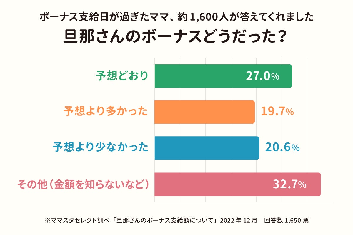 一方で残念ながら「予想より少なかった」と答えたママは20.7%。「コロナで支給額ゼロ! ボーナスなくなりました(泣)」「めちゃくちゃ減っていました。本当絶句です」といった嘆きの声から、感染症の影響があらゆる業界に響いていることもわかりますね。