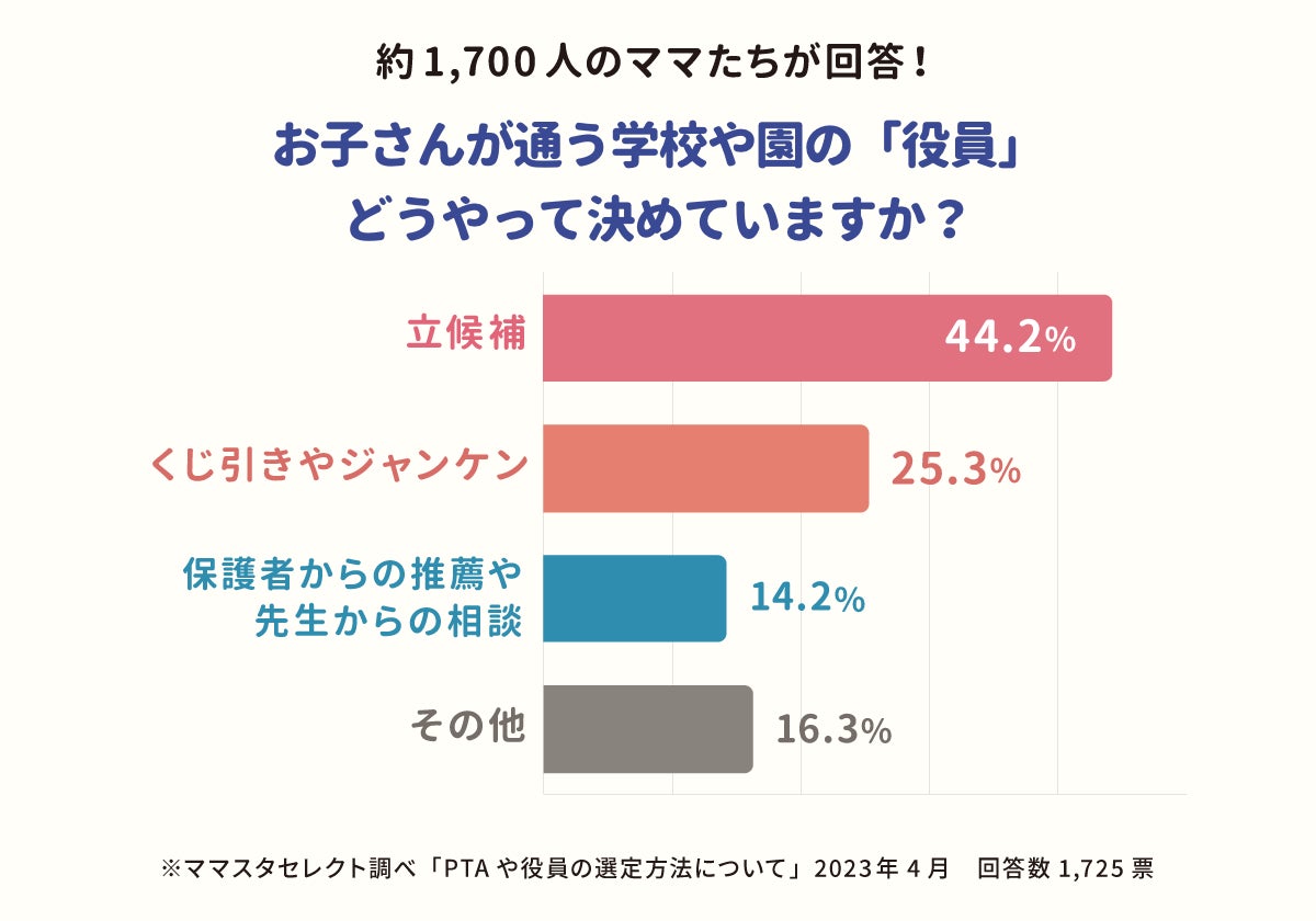 とかく否定的な声が聞かれがちなPTAなどの活動ですが、その係や役員の決め方にはさまざまな方法があるようです。今回ママスタセレクトでは、その決め方について「立候補」「くじ引きやジャンケン」「保護者や先生からの推薦・相談」「その他」の4つの選択肢でアンケートを実施。同時にママたちが理想と考える「決め方」についても聞きました。