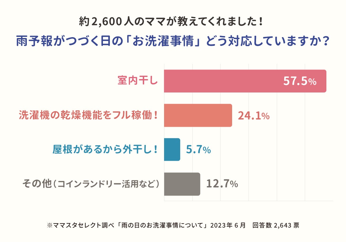 今回ママスタセレクトでは「雨予報がつづく日の「お洗濯事情」ママたちはどう対応していますか?」というアンケートを実施。選択肢に「室内干し」「洗濯機の乾燥機能を稼働」「屋根があるから外干し」「その他(コインランドリーの活用など)」を設定したところ、2,600票を超える回答が寄せられました。