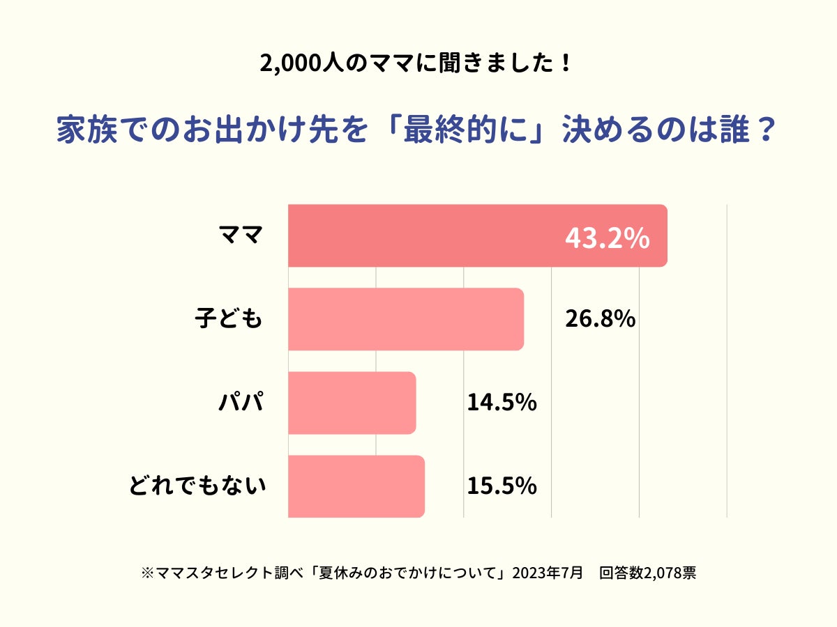家族でのお出かけを計画している家庭も多いであろう夏休みを前に、ママスタセレクトでは「家族でのお出かけ先を“最終的に”決めるのは誰?」というアンケートを実施。「子どもの意見で決める」「ママが決める」「パパが決める」「どれでもない」の4つの選択肢を設定したところ、2,000人を超える回答が集まりました。