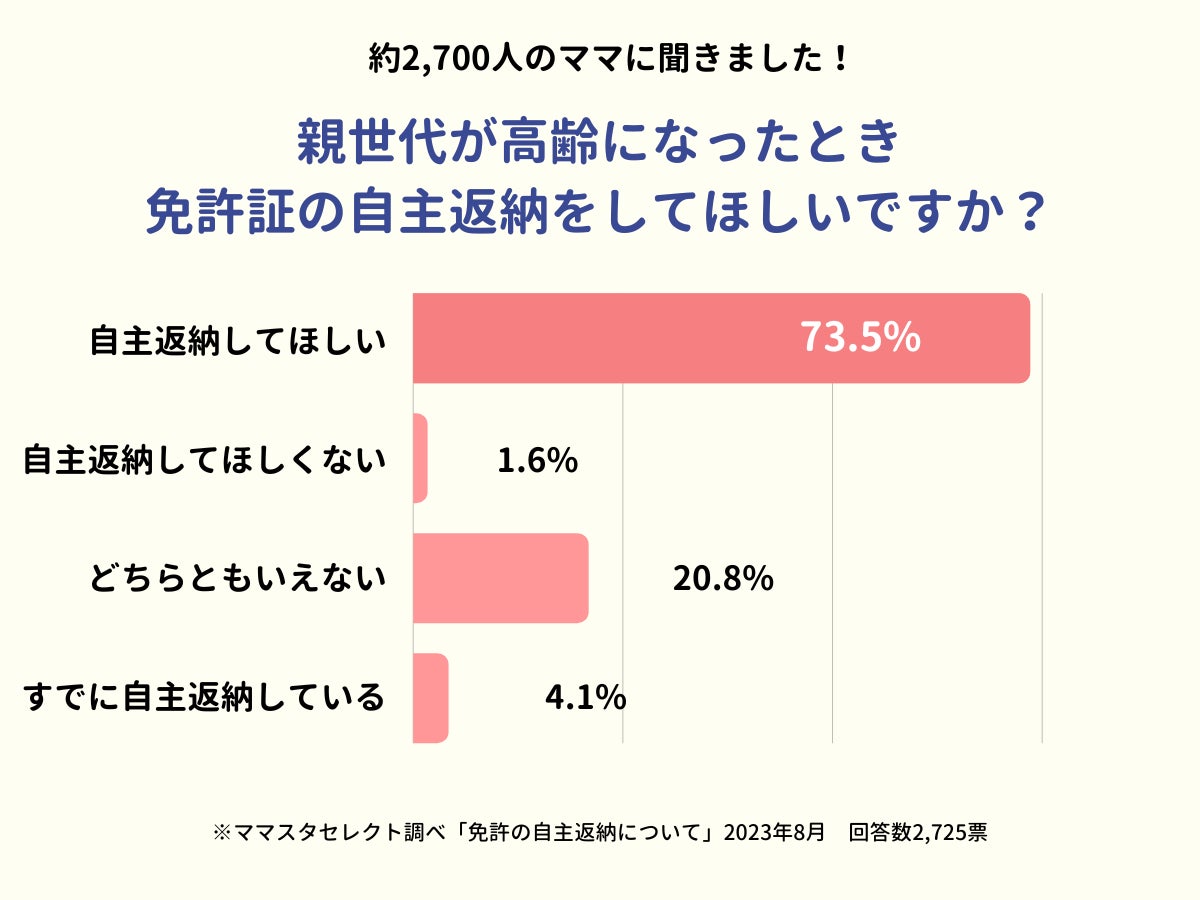 「自主返納してほしい」と回答した人がもっとも多く、全体の73.5%にのぼりました。「事故の加害者になる前に返納してほしい」という理由が大半。“できれば自主返納してほしい”ではなく、“絶対に自主返納してほしい”と強い意志を持つ人も少なくありませんでした。