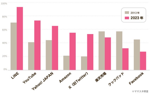 10年前との調査結果と比べ、ママが「LINEを活用」していると答えたのは2013年の調査では70%とだったのに対し、2023年の調査では93%と23%増加し、9割のママたちがLINEを活用していることが分かりました。また、「YouTube」を利用していると答えたママたちは2013年では41%、2023年では73%と32%増加していることが分かりました。