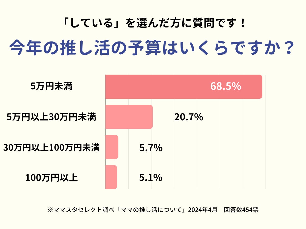 推し活をしていると回答した人へ年間の予算について聞いたところ、もっとも多かったのは「5万円未満」と答えた人たちで、全体の68.5%を占めました。一方で5.7%が予算は「30万円以上」と回答し、なかには「100万円以上」も5.1%存在しました。推し活をしているママの20人に1人が年間100万円以上使っているということになります。