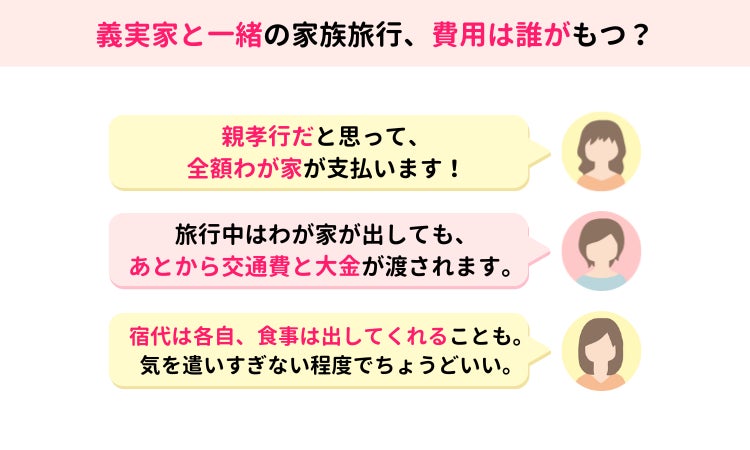 義理の家族と旅行をする人のなかには、費用面で満足していない人もいました。費用面での不満はない人からのコメントをもとに、お互いに気持ちよく旅行を楽しむための方法をまとめました。