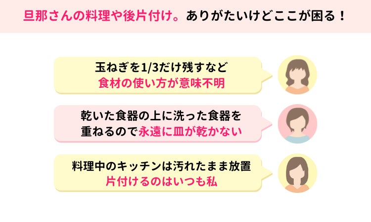 「シンクの中のものしか片付けずに、コンロや鍋を洗わない」「皿洗いのあとのシンク周りや床がビショビショ」「洗い方が雑で洗い直しが必要」。中途半端な後片付けをする人もいる様子。結局後片付けのやり直しや、やらなくてよかった掃除が発生するなど、気づいた妻がもうひと働きしなくてはならないことへの不満が募ります。