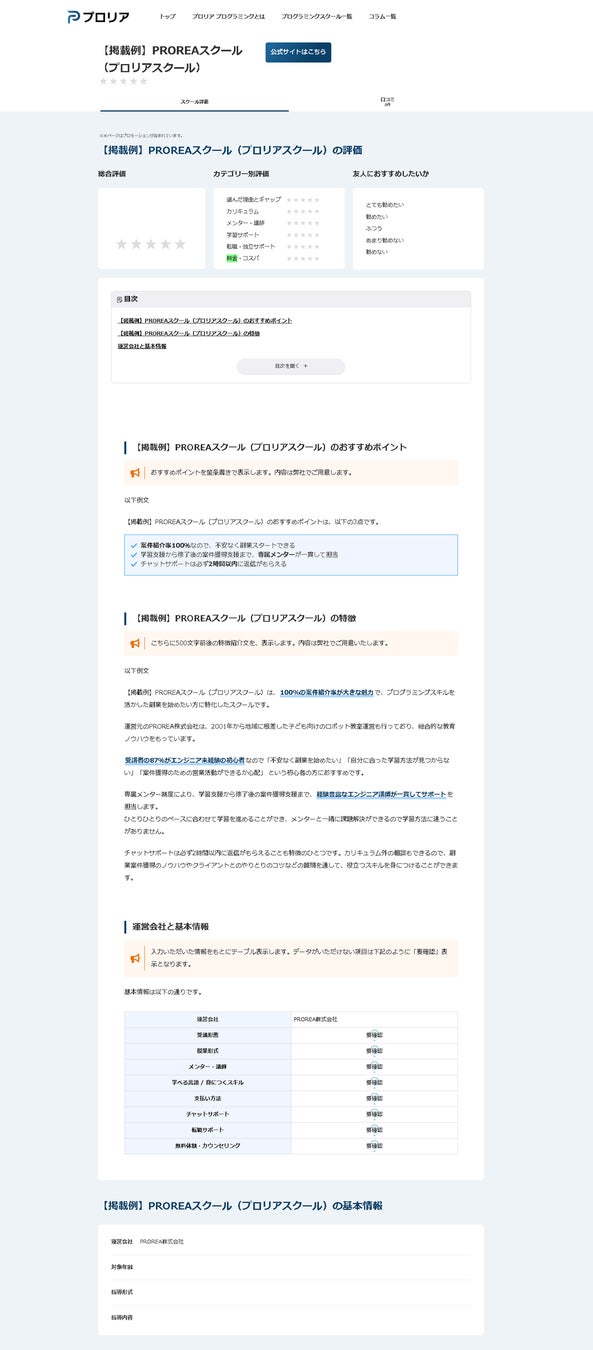 プロリア プログラミングは、2021年にリリースしたプログラミング学習者向けWebメディアです。総口コミ数2,300件を誇るほか、スクール探しや学習で迷っているユーザーをターゲットとする記事で検索上位を多く獲得しています。