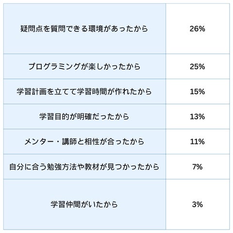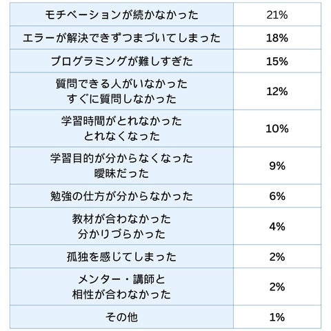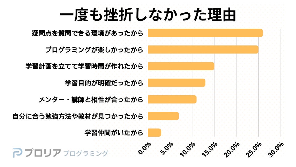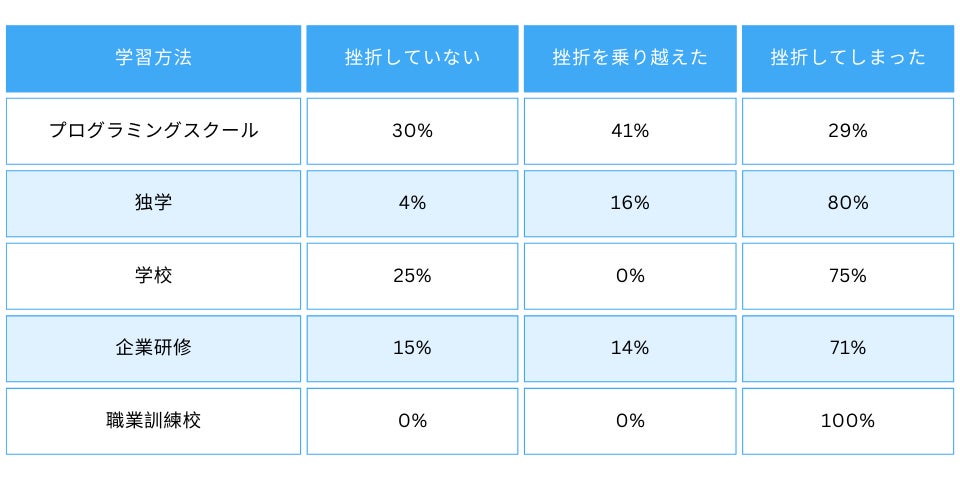 上記の重要なポイントは、いずれもプログラミングスクールで相談・解決できる項目です。そのため、プログラミングスクールでは挫折率が低い結果になったと考えられます。