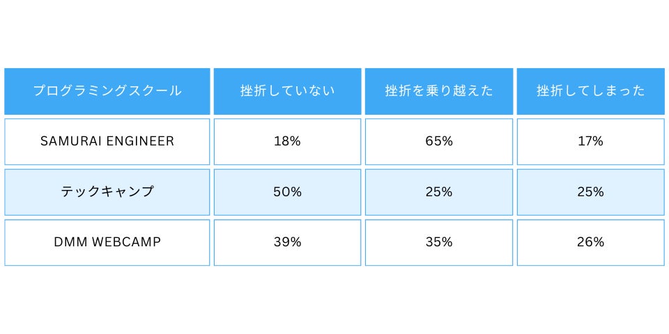 全体平均よりも挫折率が低く、回答者の多いプログラミングスクールは「SAMURAI ENGINEER」「テックキャンプ」「DMM WEBCAMP」の3スクールとなりました。