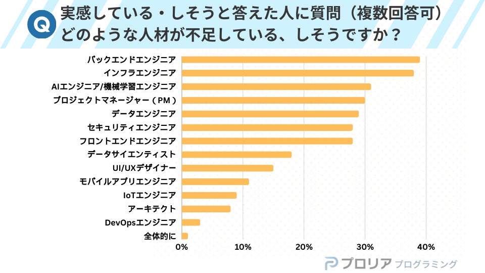 特に不足感が強いのは、システム基盤を支えるバックエンドエンジニア(39%)、インフラエンジニア(38%)で、AI・データ関連人材であるAIエンジニア/機械学習エンジニア(31%)、データエンジニア(29%)の不足も深刻化していることが分かりました。
