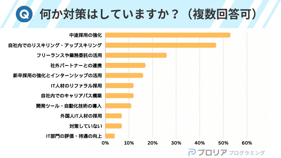 この状況を受け、企業は人材獲得・育成に積極的な姿勢を見せています。対策として最も多かったのは「中途採用の強化」(53%)、次いで「自社内でのリスキリング・アップスキリング」(47%)、「フリーランスや業務委託の活用」(26%)となりました。