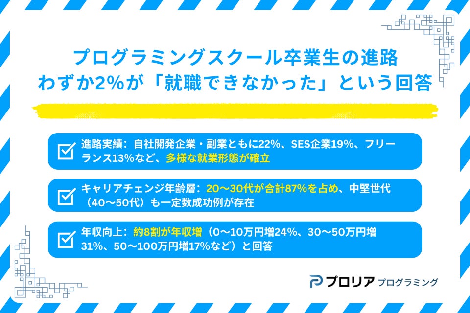 就職できなかったのはわずか2%で、残りは自社開発・副業・SES・フリーランスなど幅広い道へ。これらの事例は「転職できない」という偏見を覆し、スクール卒業後の確かな可能性を示しています。